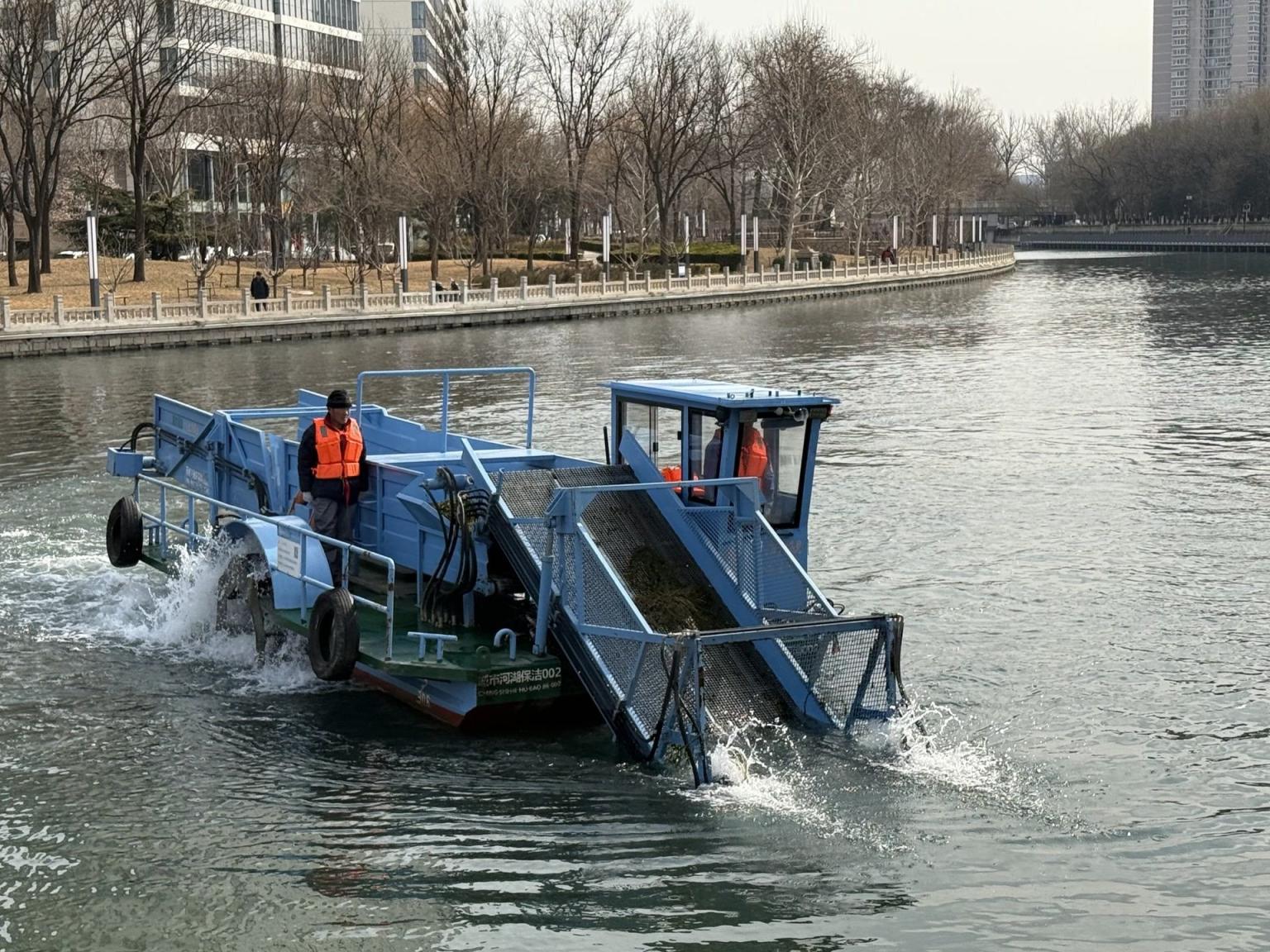 这几天,如果来到位于永定河引水渠岸边的滨角园公园,常常能看到河道中央,水务工作人员驾驶全自动保洁船,对水面上漂浮的水草、枯枝等进行打捞作业。“这个船经过的区域,垃圾都会自动经过传送带上传到船舱里,漂浮物、水草都能全覆盖地进行打捞,收满之后就可以到指定的装卸点装卸垃圾,目前的作业频次是每天两到三次。”北京市城市河湖管理处水环境管理科科员刘琦说。